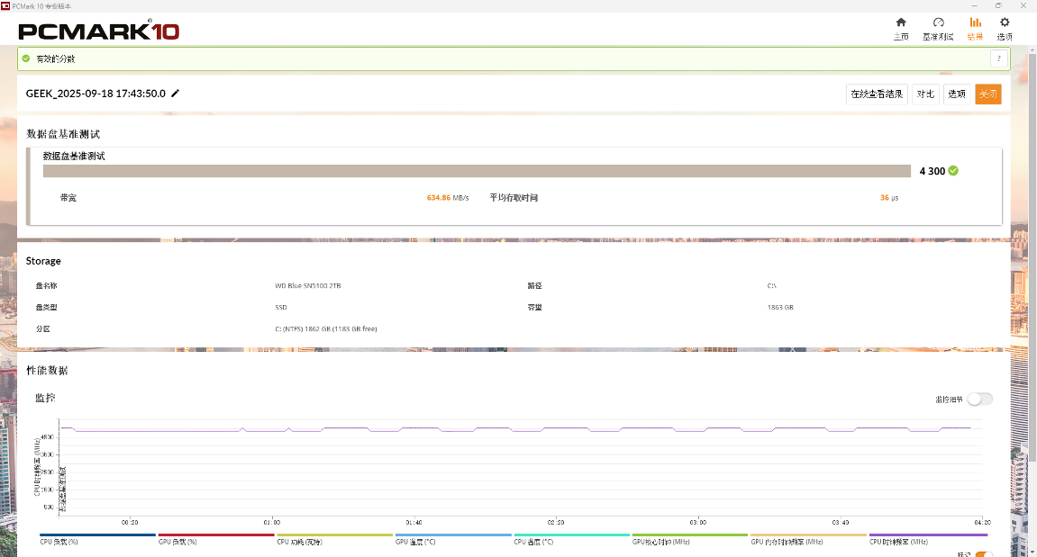 在PCMARK10数据盘基准测试中, SN5100最终得到4300分,带宽为634.86MB/s,平均存取时间为36μs 。