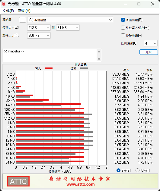 在ATTO磁盘基准测试中,可以看到SN5100的最大顺序写入速率在6.05GB/s,最大顺序读取速率在6.81GB/s。同时,其在256KB传输大小下,写入速度与读取速度几乎能够达到峰值。