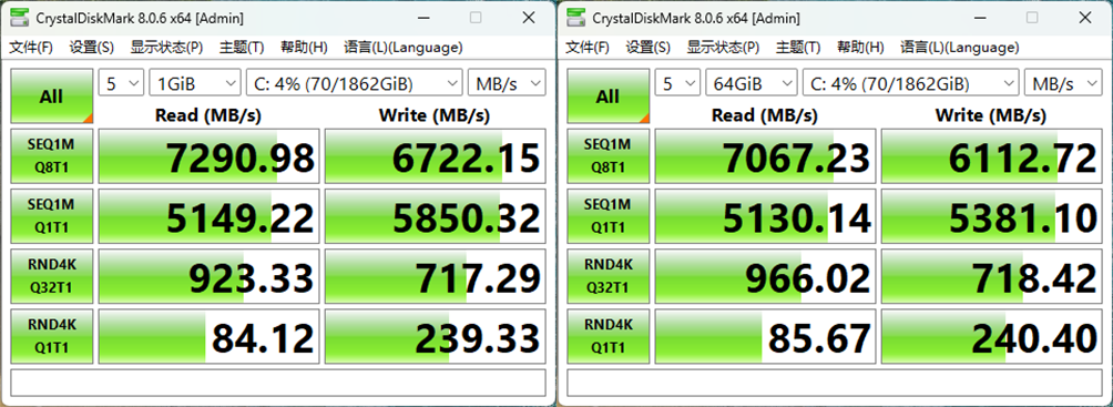 在CrystalDiskMark测试中, SN5100在1Gib测试模式下的最高顺序读取速度达7290.98MB/s,最高顺序写入速度达6722.15MB/s,此速度高于该SSD标称的传输性能,其性能表现不错。同时,我们还对其在64GiB模式下的性能进行了测试,结果显示其最高顺序读取速度为7067.23MB/s,最高顺序写入速度为6112.72MB/s。同时,其4K表现亦值得认可。