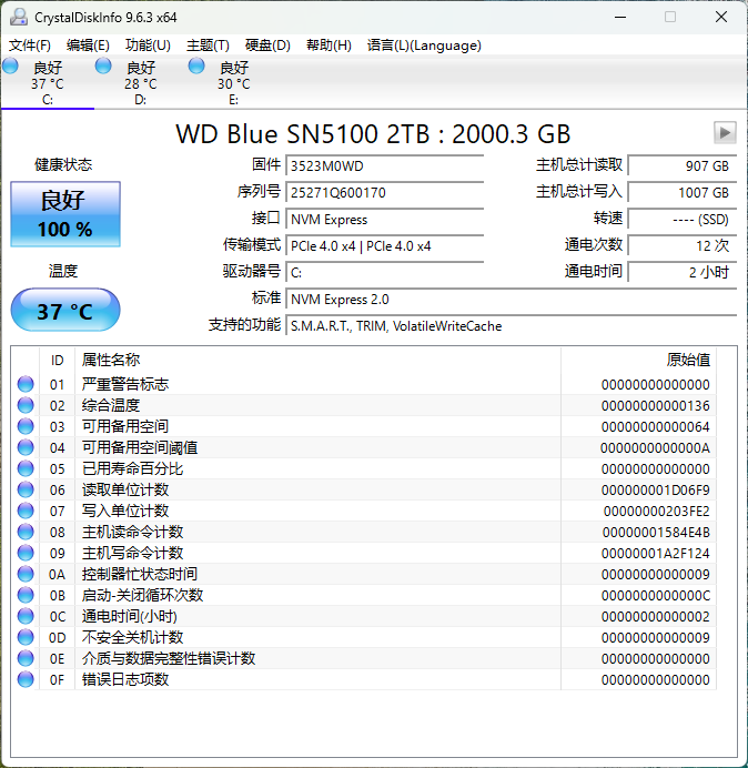 测试平台方面我们选用了AMD锐龙5 9500F与AMD B860作为平台基础。通过CrystalDiskInfo,我们可以看到SN5100采用PCle 4.0x4通道、符合NVMe 2.0标准,这意味着它在数据传输效率和功能特性上均达到主流水准,同时该固态硬盘还支持S.M.A.R.T.、TRIM、VolatileWriteCache功能。