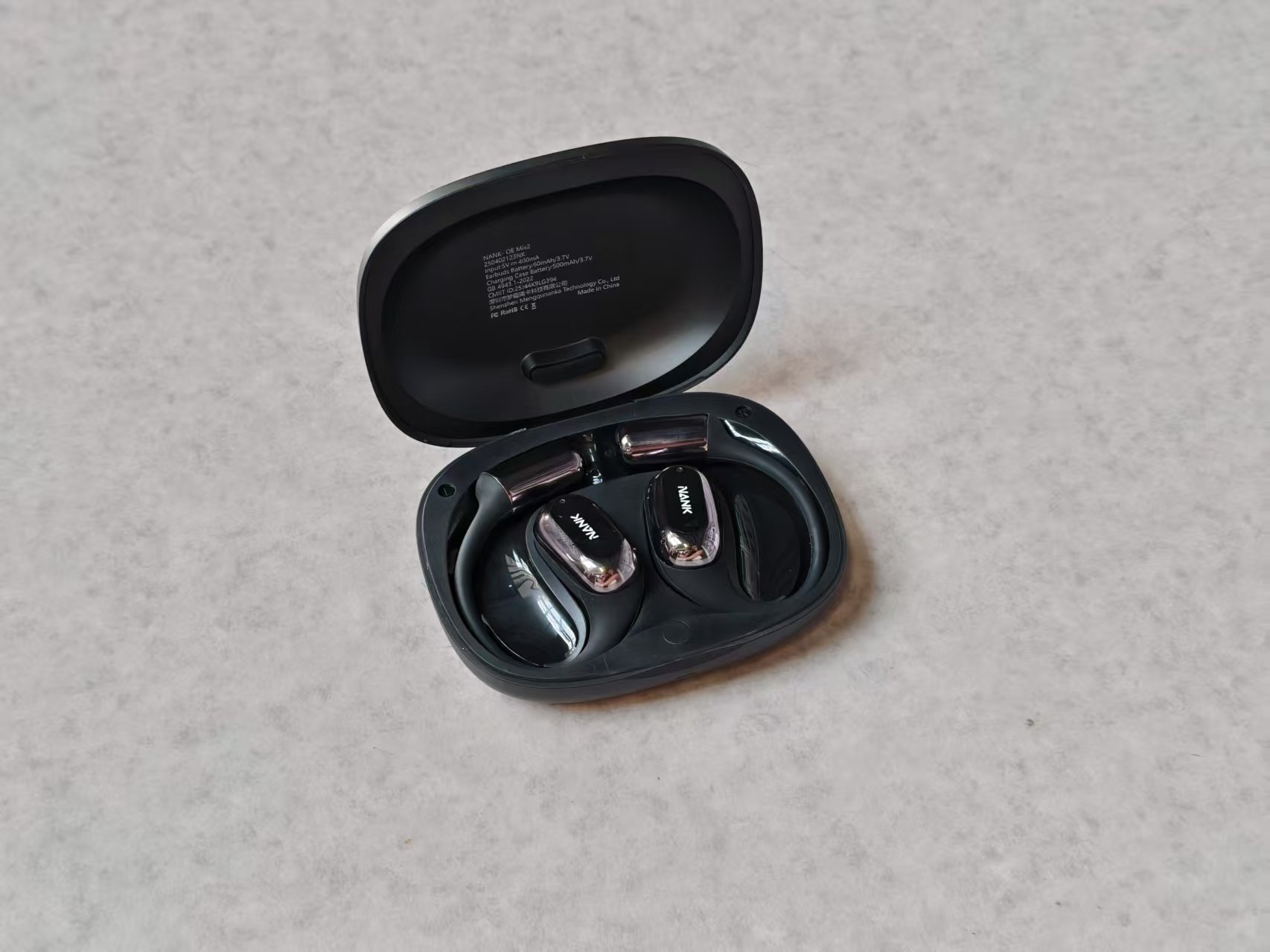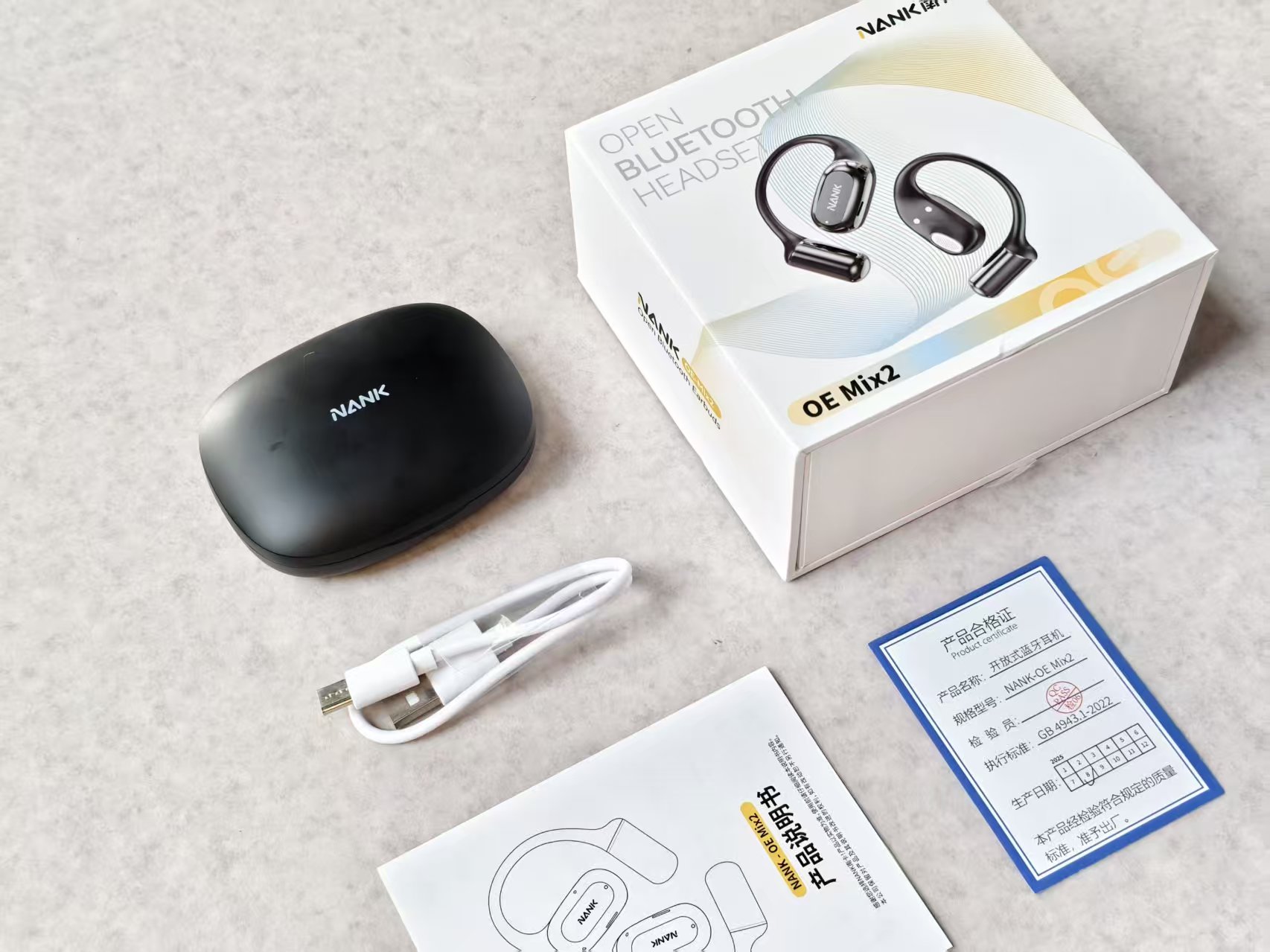 配件方面还是传统的配方。包装盒内包含了南卡OE Mix2开放式耳机的主体、耳机的充电仓、一根Type-C接口的充电线、说明书以及合格证。