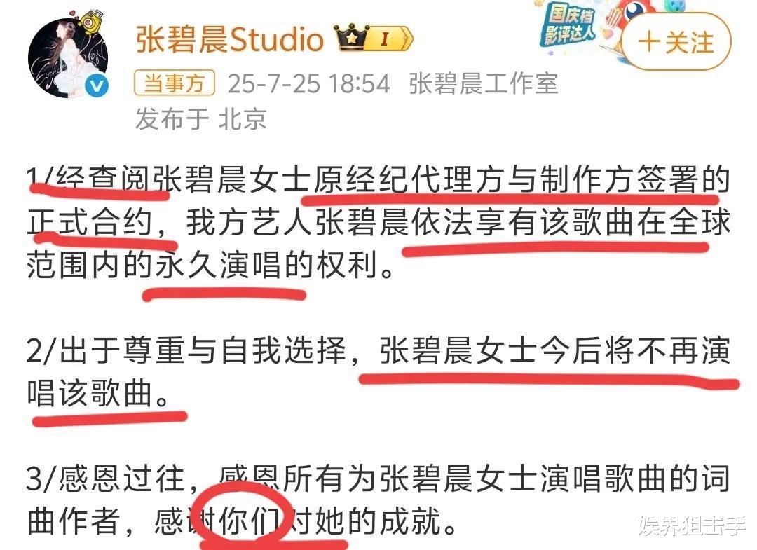第二句:“张碧晨依法享有该歌曲在全球范围内的永久演唱的权利。”