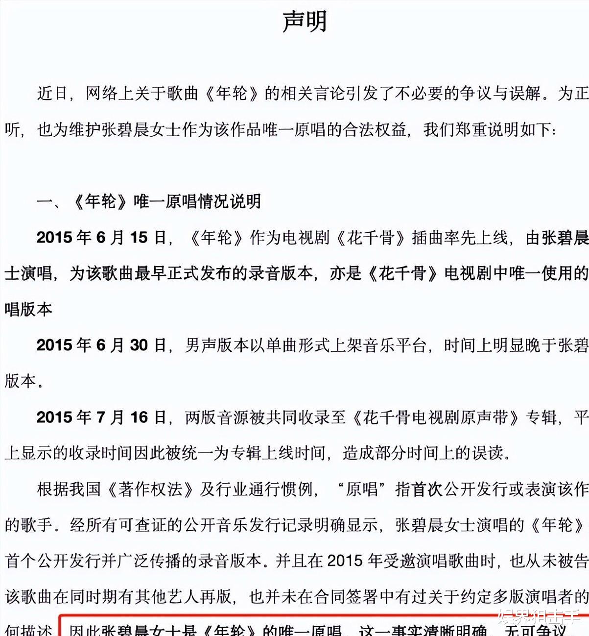 解剖对象:张碧晨工作室关于《年轮》的那份声明。