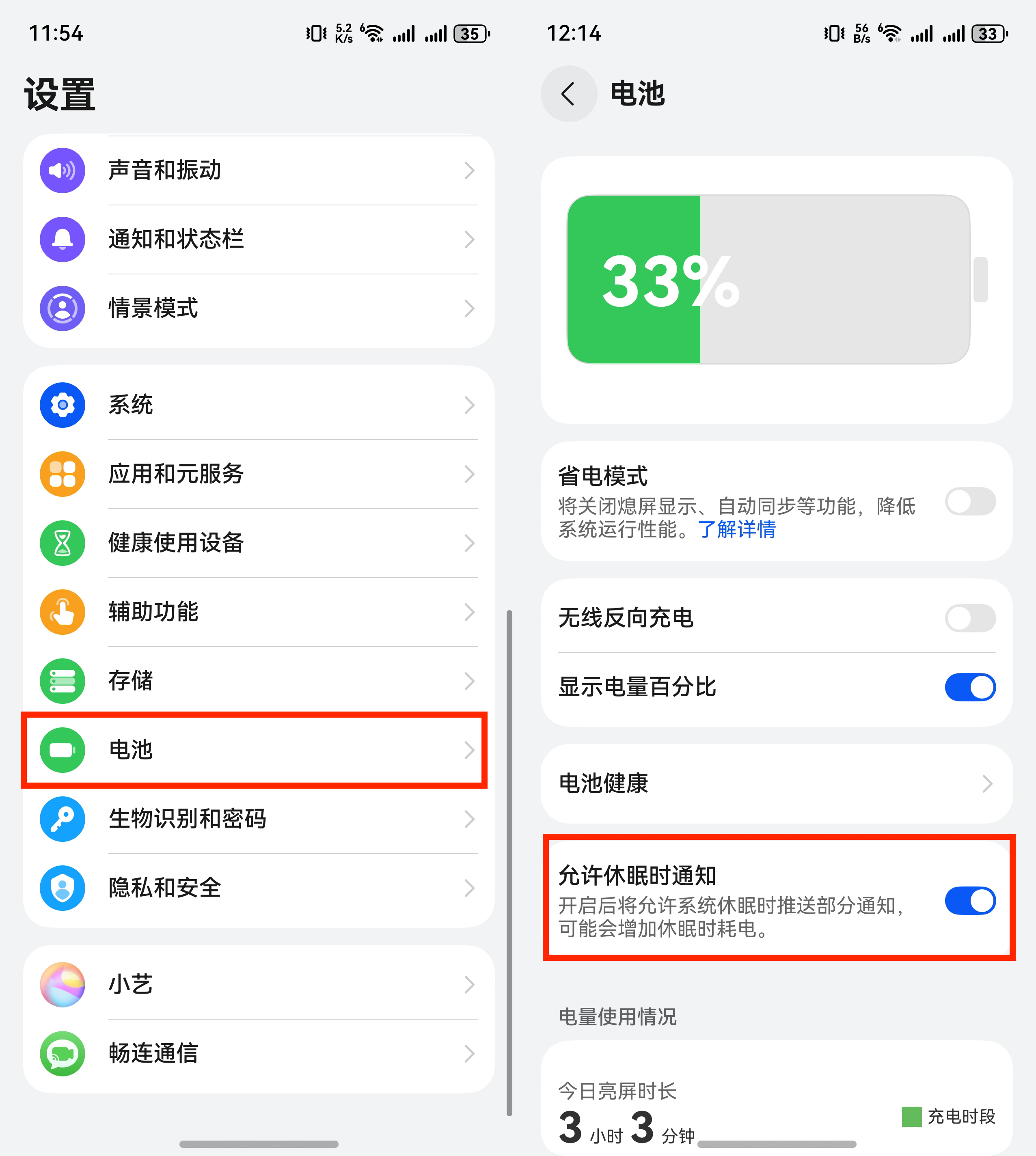 省电模式要关掉!进入“设置”,搜索“电池”选项,关闭“省电模式”,再打开“允许休眠时通知”,这样即使手机锁屏休眠,微信消息也能及时到达。