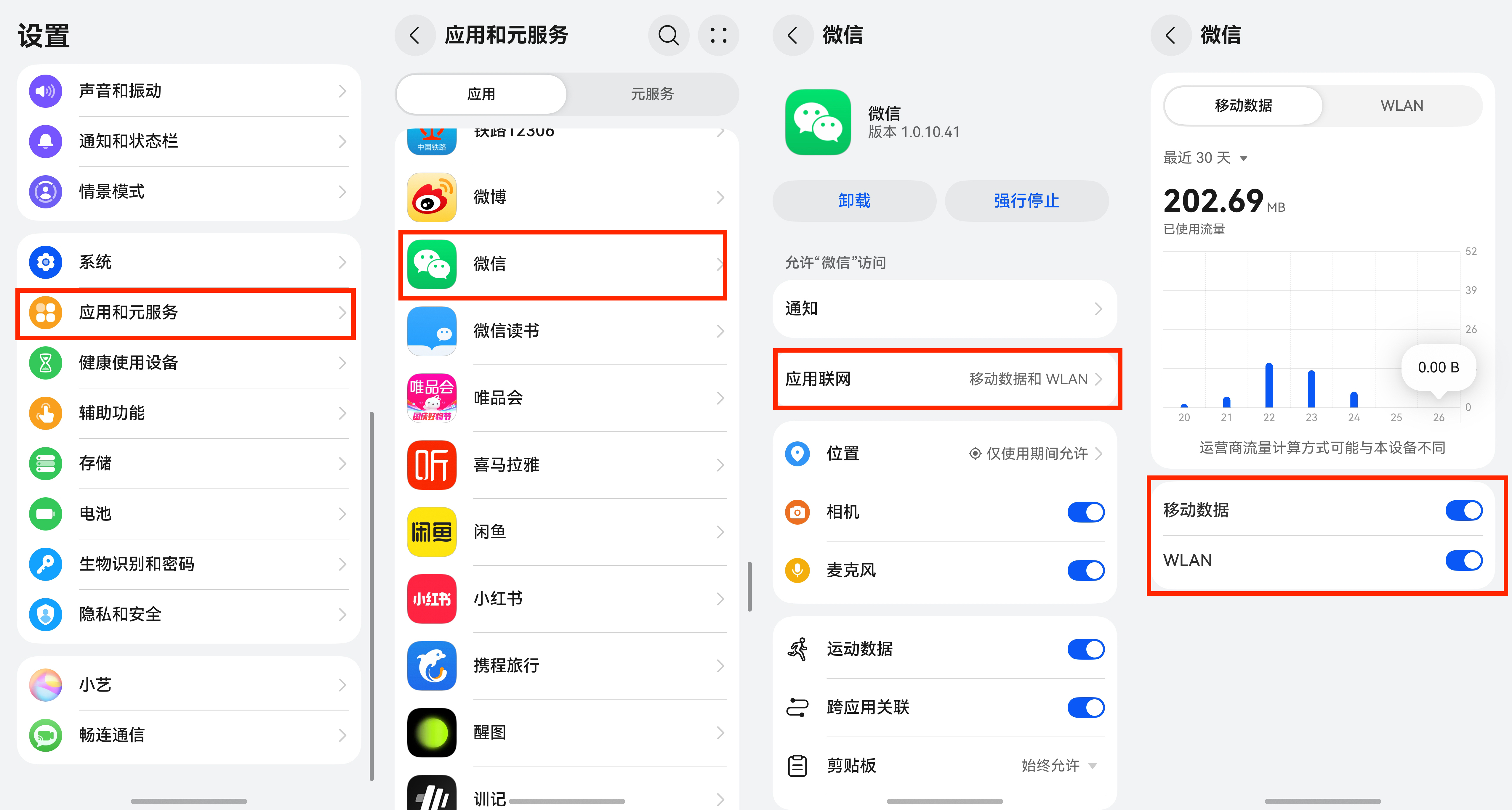 同时,还得确认微信联网权限有没有被限制,没网肯定收不到消息。在“设置”里找到“应用和元服务”后找到微信,检查“应用联网”是否开启了移动数据或WLAN权限。