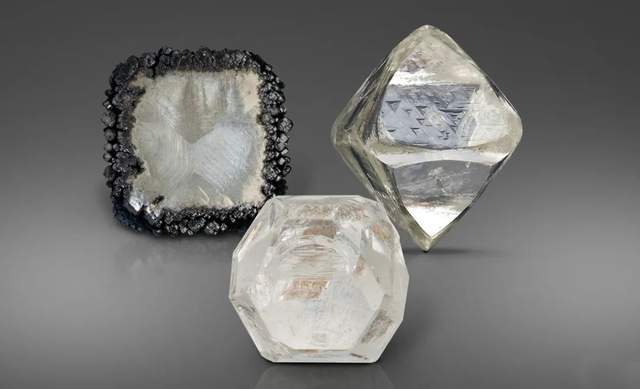 (图为CVD合成钻石、HPHT合成钻石和天然钻石晶体)