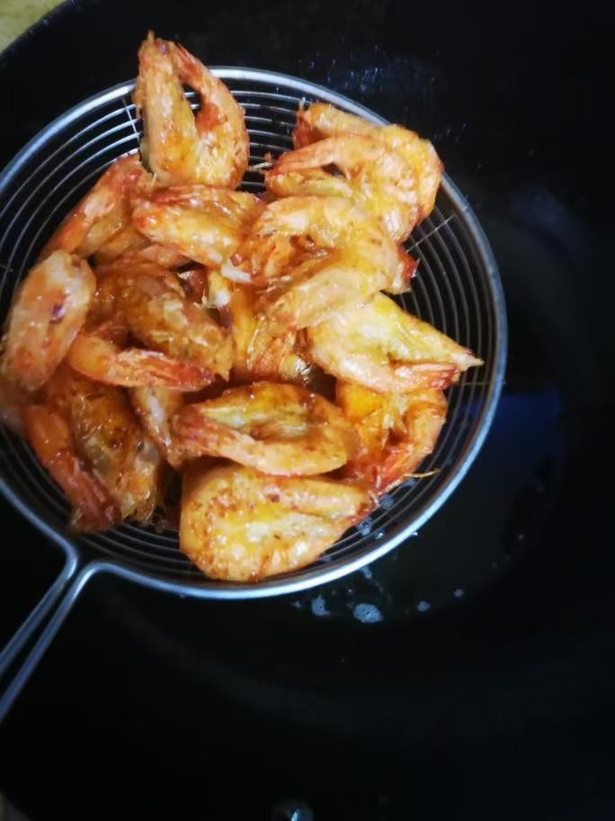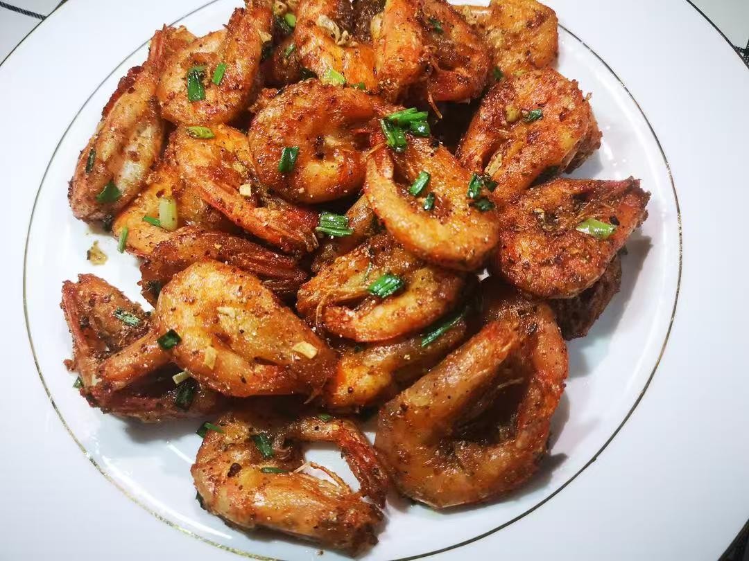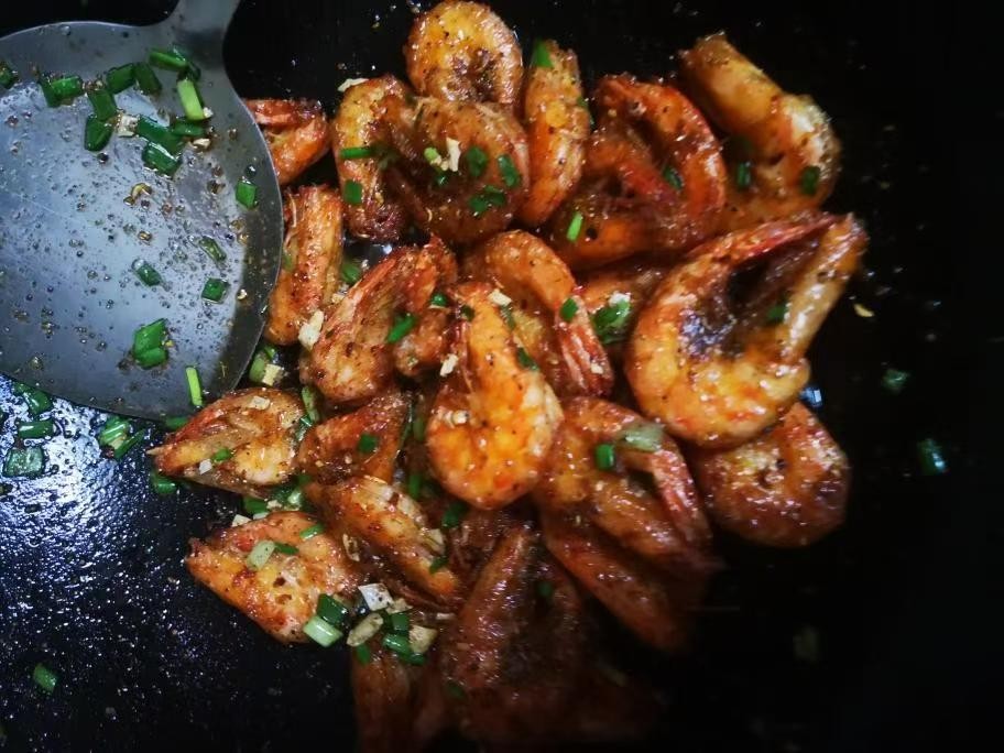 留少量热油,葱姜蒜末爆香,倒入炸好的虾,撒椒盐,翻炒均匀。