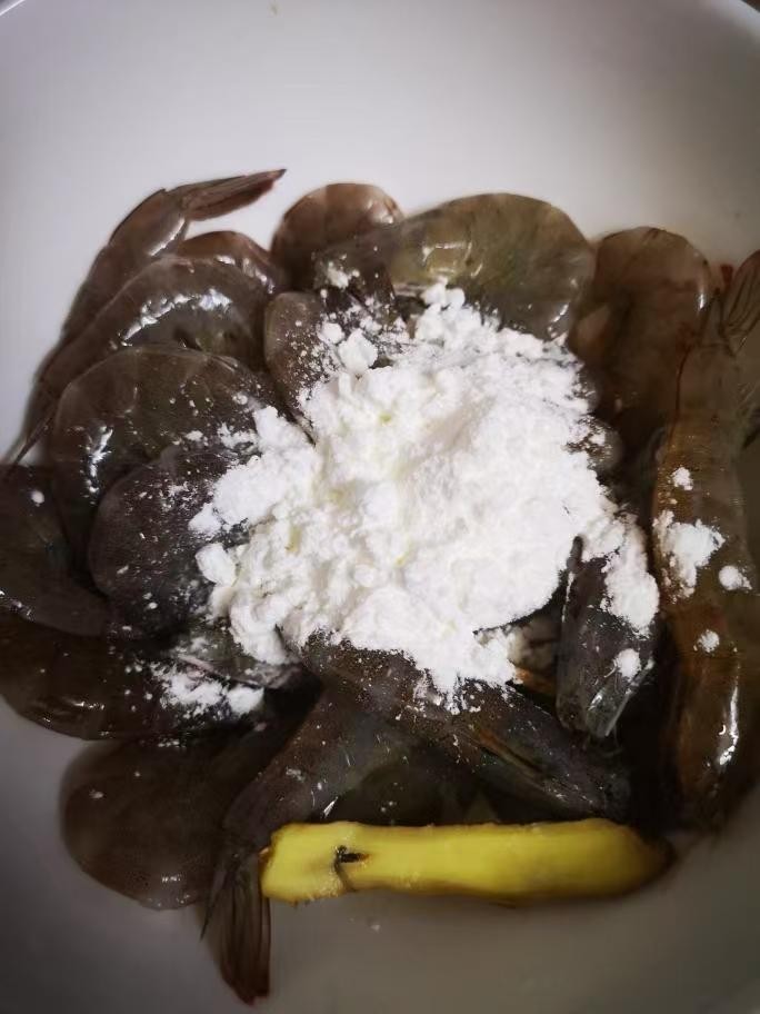食材:大虾、料酒、葱、姜、蒜、淀粉、椒盐