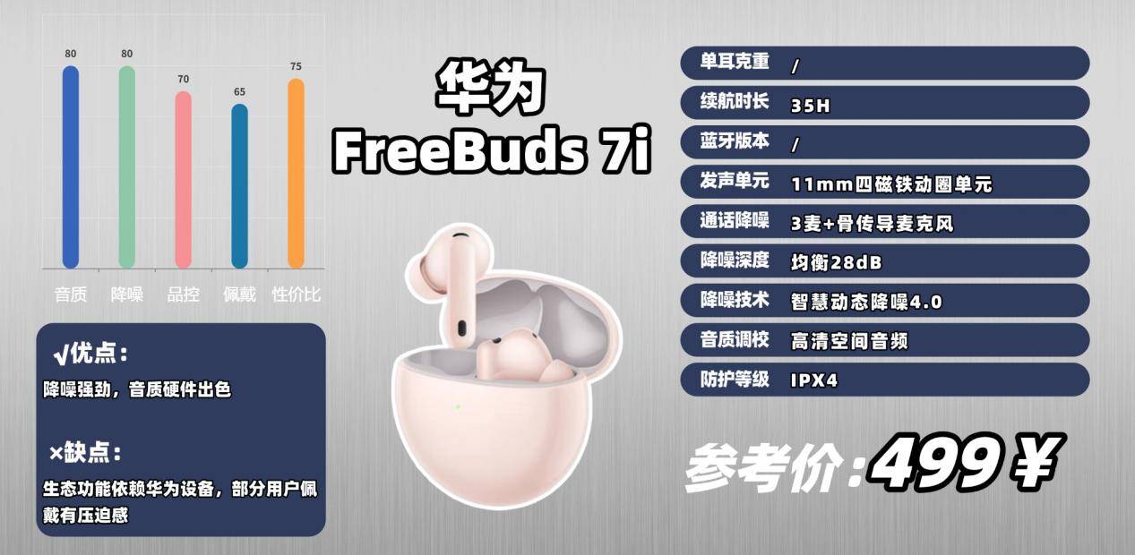 如果你在意降噪和音质表现,FreeBuds 7i 是一款值得关注的真无线耳机。它的核心卖点就是主动降噪,搭载了智慧动态降噪 4.0 技术,对地铁、办公室等常见环境噪声的抑制效果明显。官方数据给出的平均降噪深度约 28dB,实际体验中对低频噪音削减感受比较明显。不过也有用户反馈,开启强降噪模式后耳压感略重;而在应对突发性尖锐噪音时,反应速度还达不到旗舰级水准。