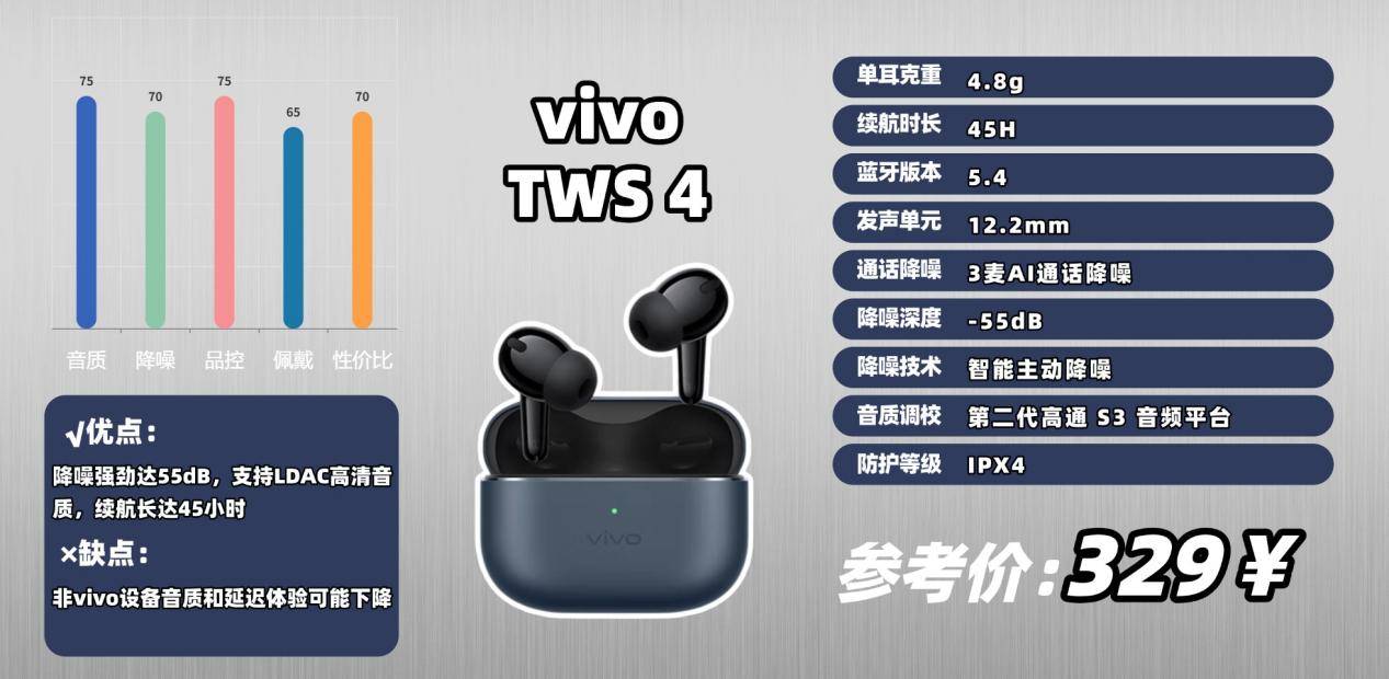 关闭降噪时,搭配充电盒可用约 45 小时,并支持快充。采用蓝牙 5.4 协议,连接稳定,但延迟表现稍有争议。官方标称最低 44ms,不过非 vivo 手机在游戏时仍可能感到延迟略高。