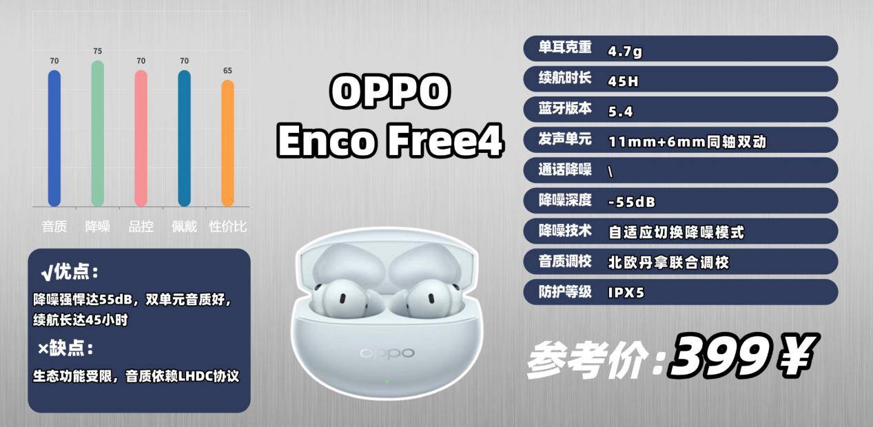 需要注意的是,它的低延迟模式、“灵动蓝牙”、AI 翻译等功能在 OPPO 生态内体验最好,连接其他品牌设备时部分功能会受限。总体来说,Enco Free4 是一款以降噪和音质取胜的耳机,尤其适合使用 OPPO 手机的用户。