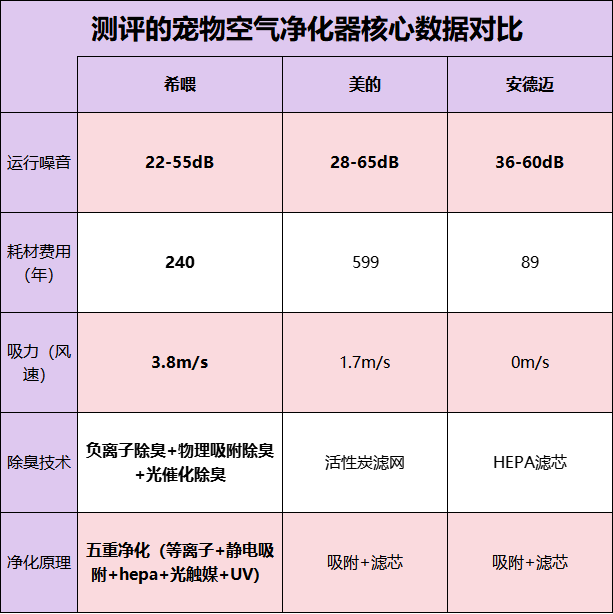 于是我开始认真研究宠物空气净化器的工作原理、结构差异,还看了不少实测数据和拆机图。最后挑了三款热度和口碑都不错的机型:希喂 FreAir Lite、美的 KJ400G 和安德迈 9920s,从风速、除毛和除臭三方面做了对比测试。