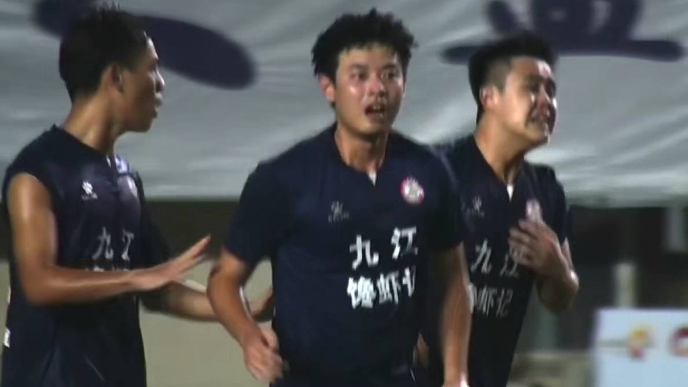 第82分钟,九江队获得前场右侧的定位球机,63号球员章宇涛接队友妙传,禁区内抢点头球破门,九江队扳平比分,1-1。