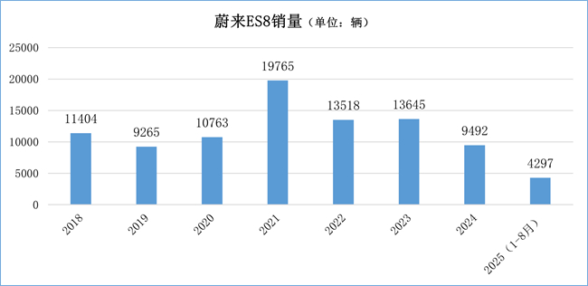 如上图所示,交强险数据显示,自2018年至2025年8月,蔚来ES8累计上险量为92149辆。其中,2021年的销量最高,接近2万辆,其他年份基本在1万-1.3万辆上下,2019年和2024年则不足1万辆。从每年卖1万辆到每个月卖1万辆,奇迹会出现吗?