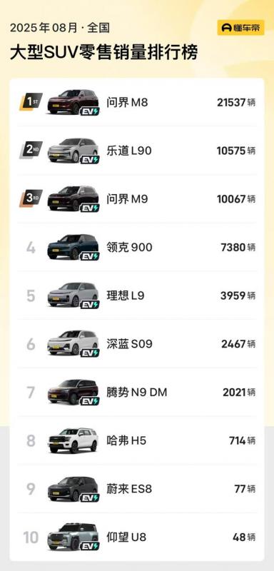 与竞品相比,全新ES8的价格适中,既不是很高,但也不低。它的起售价与理想L9接近,最高售价与问界M8接近 。据懂车帝的数据,8月份大型SUV的销量排行榜前5名中,按排名依次是: