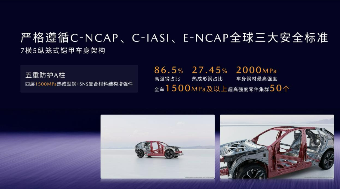 卓越的碰撞成绩来自于车身结构的创新。EZ-60采用7横5纵的笼式铠甲结构,高强钢占比86.5%,热成形钢27.45%,最高强度2000MPa,全车1500MPa及以上超高强度零件集群50个,关键部位更是层层加码,如A柱采用五重防护结构,内外双层1500MPa热成型钢和腔体SNS复合材料,大幅增强A柱的钣金强度和刚度,抗弯性能提升44%。
