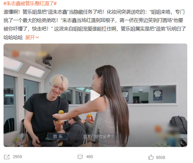 看到这样的评论,许多网友都不知道发生什么事情,原来在录制节目的过程中,管乐去逗了朱志鑫,专门挑水果给对方,结果朱志鑫当场红温了,蒋一侨连忙打圆场:他要给你吓懵了,快走吧!