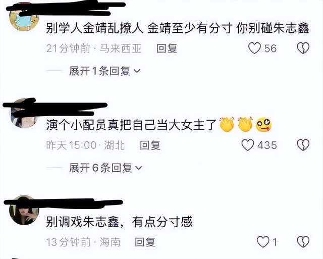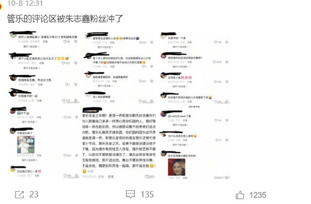 节目播出后,网友们发现管乐的评论区被朱志鑫的粉丝直接冲了,有网友表示:别乱学金靖撩人,金靖至少有分寸感,你别碰朱志鑫等。