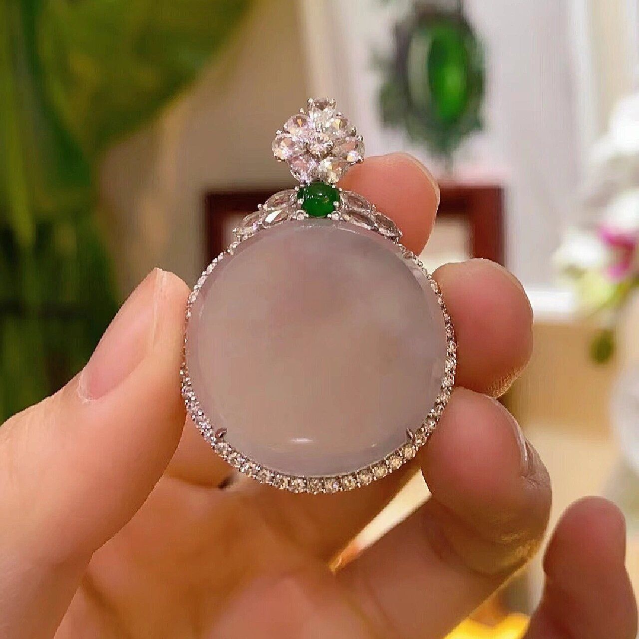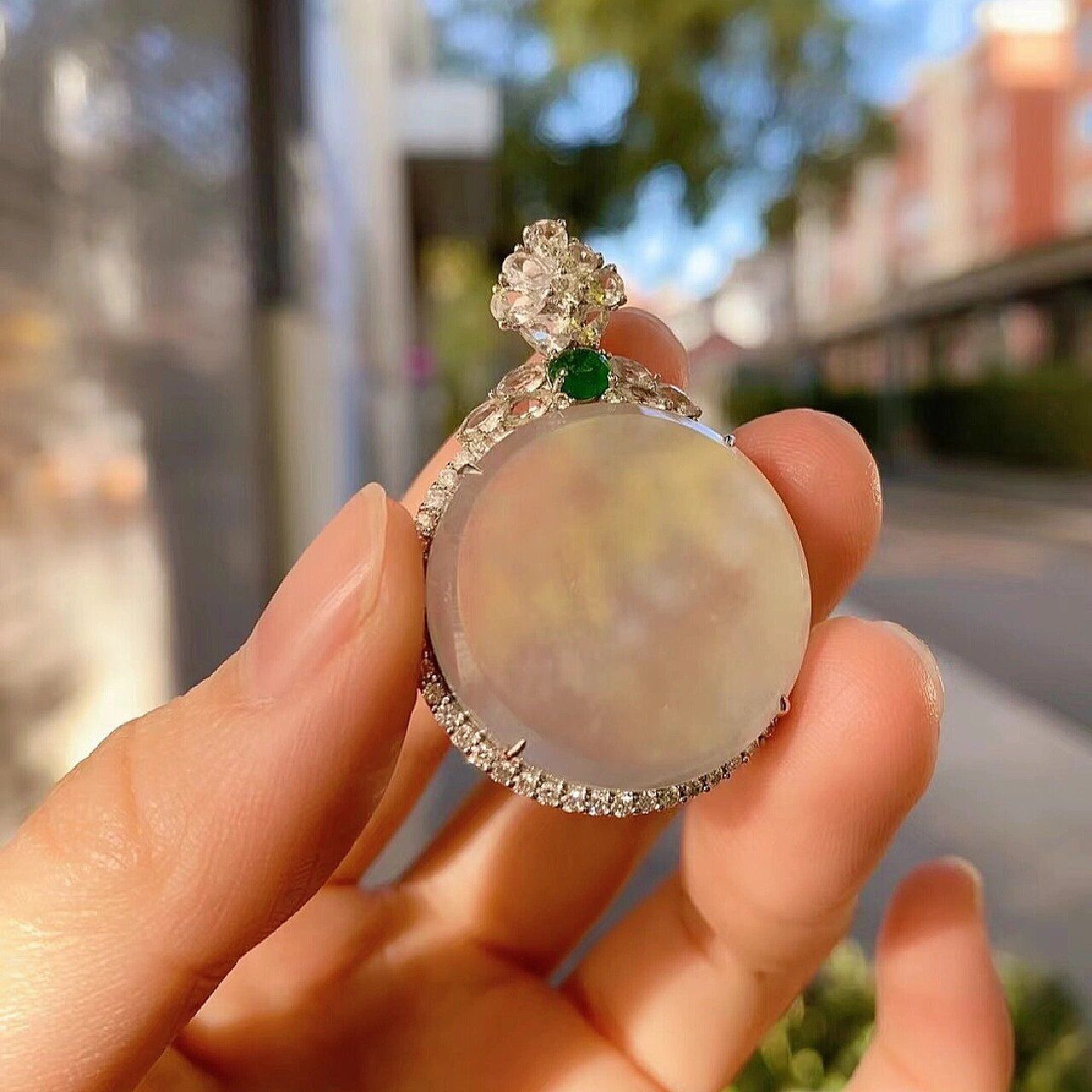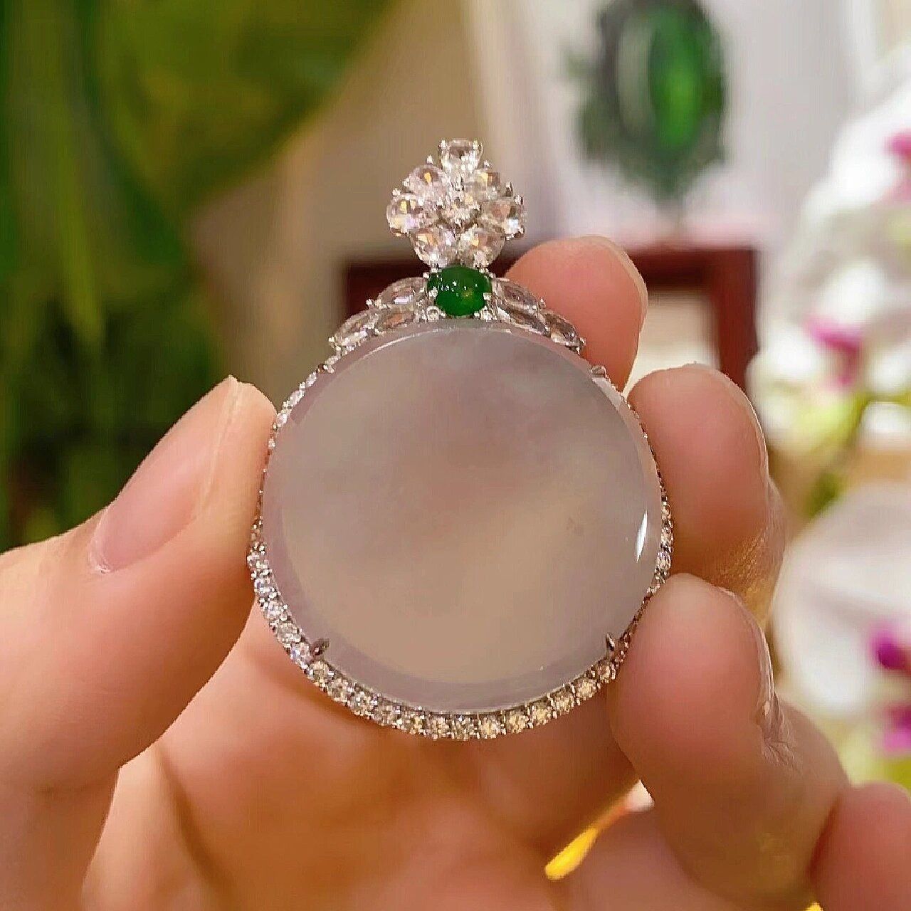 钻石的巧妙环绕让白圆牌更显清怡清圆,摩挲之间,欣赏之时,皆觉圆满。这种简洁而精致的设计,让吊坠在不经意间展现出一种淡雅的美感。