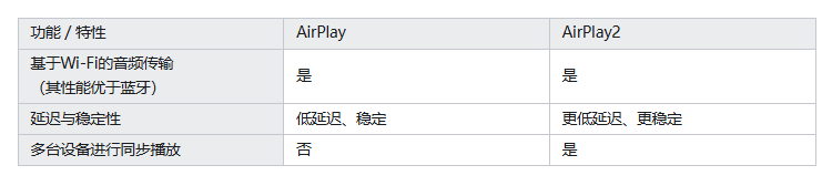 相比传统蓝牙传输,AirPlay依托高带宽 Wi-Fi ,实现更低延迟与更高稳定性的传输方式,让声音表现更加流畅、精准。2018年,Apple更是在AirPlay原有的性能基础上,推出了AirPlay2,为音频传输添加势能。