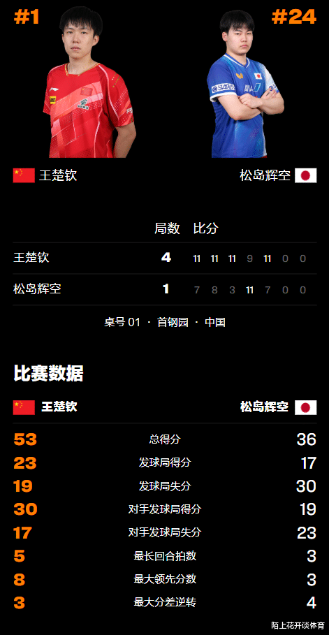 第三局比赛松岛辉空改用勾手发球,但王楚钦直接加质量爆冲的打法,让对手根本发挥不出发球体系的威胁,凭借着火热的手感,王楚钦上来就打了松岛辉空一个5-1,尽管日本小将也没有放弃,一直在寻找应对之策,可惜他面对的是火力全开的世界第一,状态火热的王楚钦,扛住了对手的反扑,轻松以11-1拿下了这一局。