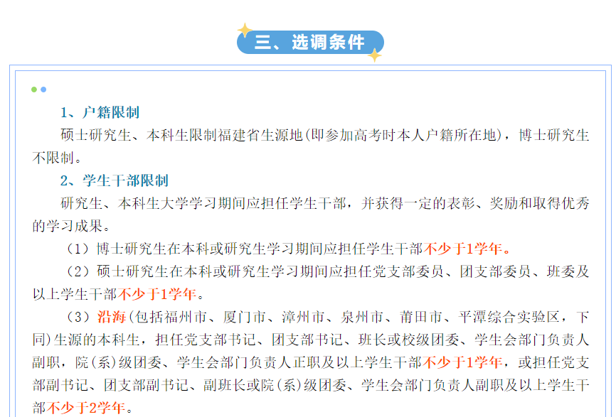 不过福建选调生考试还有一大特殊的不同是其在全国选调中有户籍的限制,比如硕士和本科限制为福建户籍,博士才开放不限户籍的要求,所以对打算报考福建选调生的考生来讲,一定要先了解自己是否满足条件,否则连报考的资格都没有。