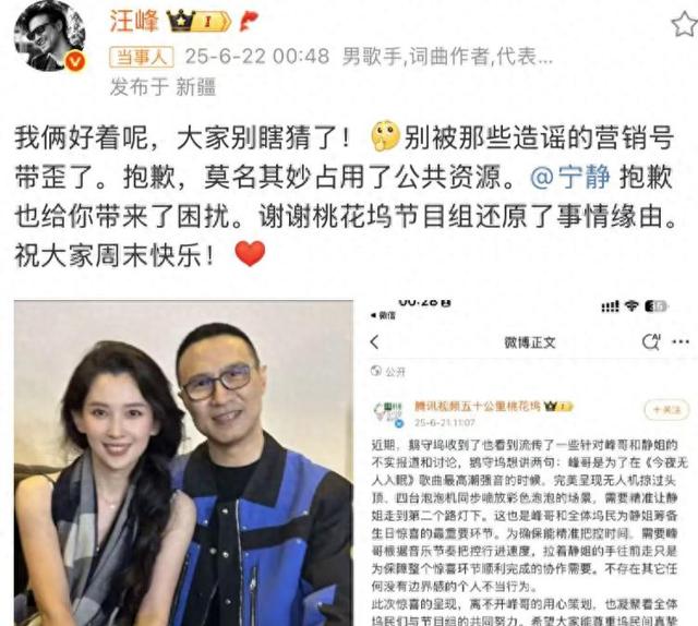 终于,汪峰坐不住了,在昨日6月21日深夜,汪峰晒出了与森林北的合照,表示与女友关系好着呢,而综艺节目剧组也通过官方微博替汪峰澄清,表示汪峰为宁静过生日的环节都是节目设计,足以见得汪峰对于森林北还是很维护的。