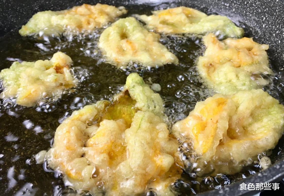 1.摘未绽放的西葫芦花,去花蕊,裹蛋液面粉。