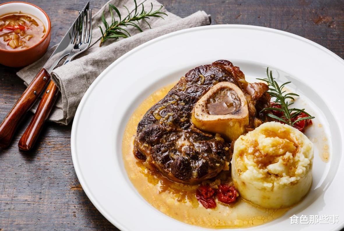 米兰炖小牛膝:小牛膝肉与葡萄酒、高汤和蔬菜慢慢炖煮。