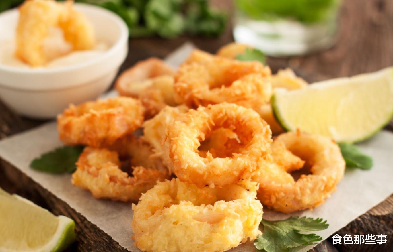 炸鱿鱼:轻裹面糊油炸的鱿鱼,配以柠檬角。
