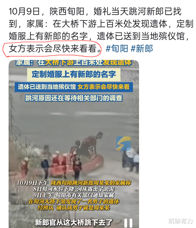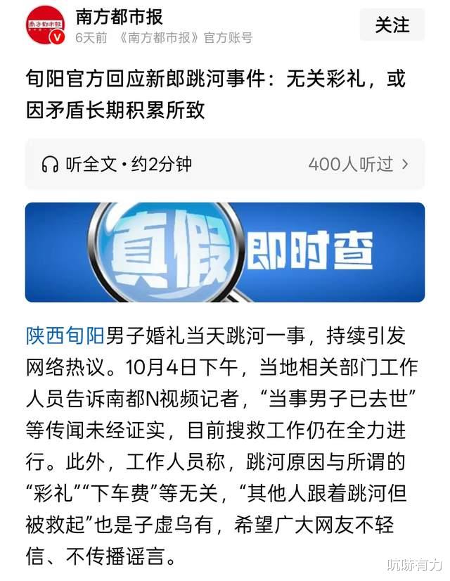 南方都市报《旬阳官方回应新郎跳河事件:无关彩礼,或因矛盾长期积累所致》