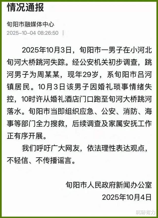 旬阳官方通报中也仅仅写着“因婚礼琐事情绪失控”,全力搜救中。