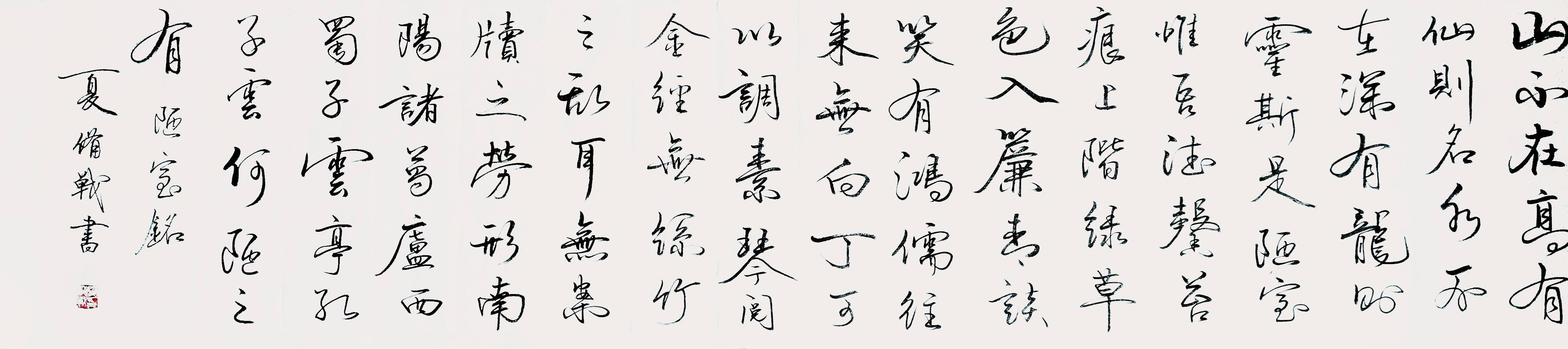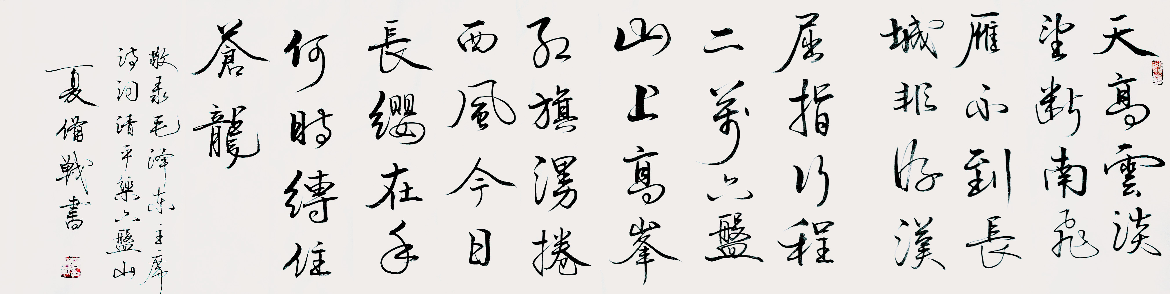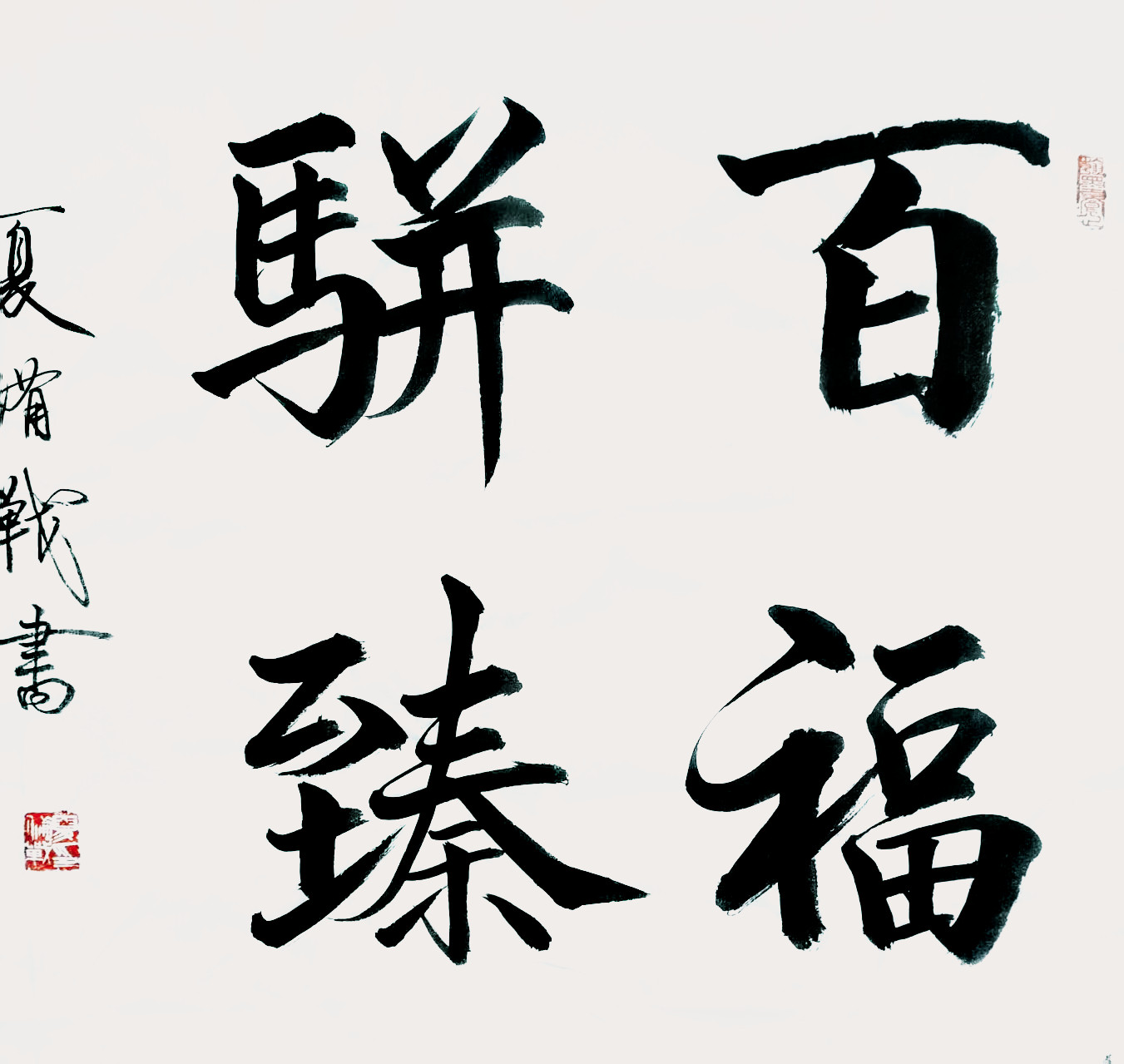 夏备战书法,笔力遒劲,线条刚柔相济,如行云流水而不失骨力;墨色层次丰富,枯润相生,韵味悠长,于笔墨流转间尽显深厚传统造诣。他深耕历代名家经典,临习不辍,兼收并蓄诸家之长;更注重书法理论研修与字外功夫积淀,融古今之韵,拓艺术新境,终成独树一帜的艺术风格。