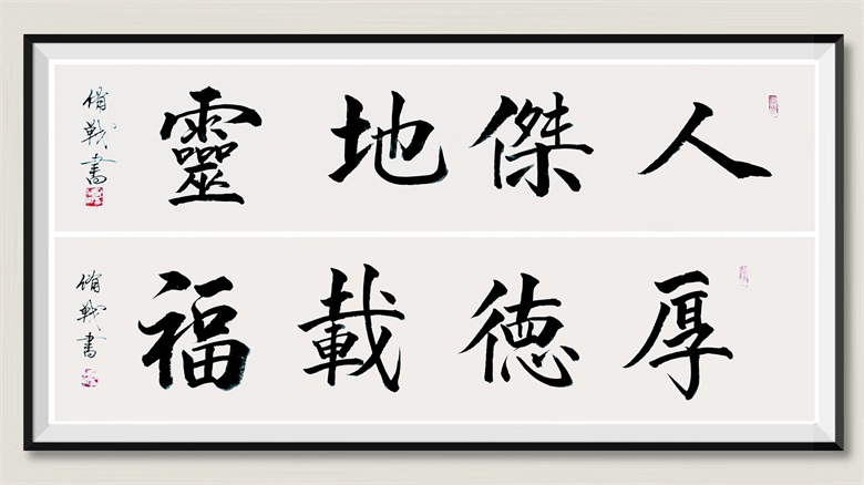 夏备战书法作品上:《卜算子·咏梅·毛泽东》下:《临江仙·滚滚长江东逝水·杨慎》夏备战书法作品上:《人杰地灵》下:《厚德载
