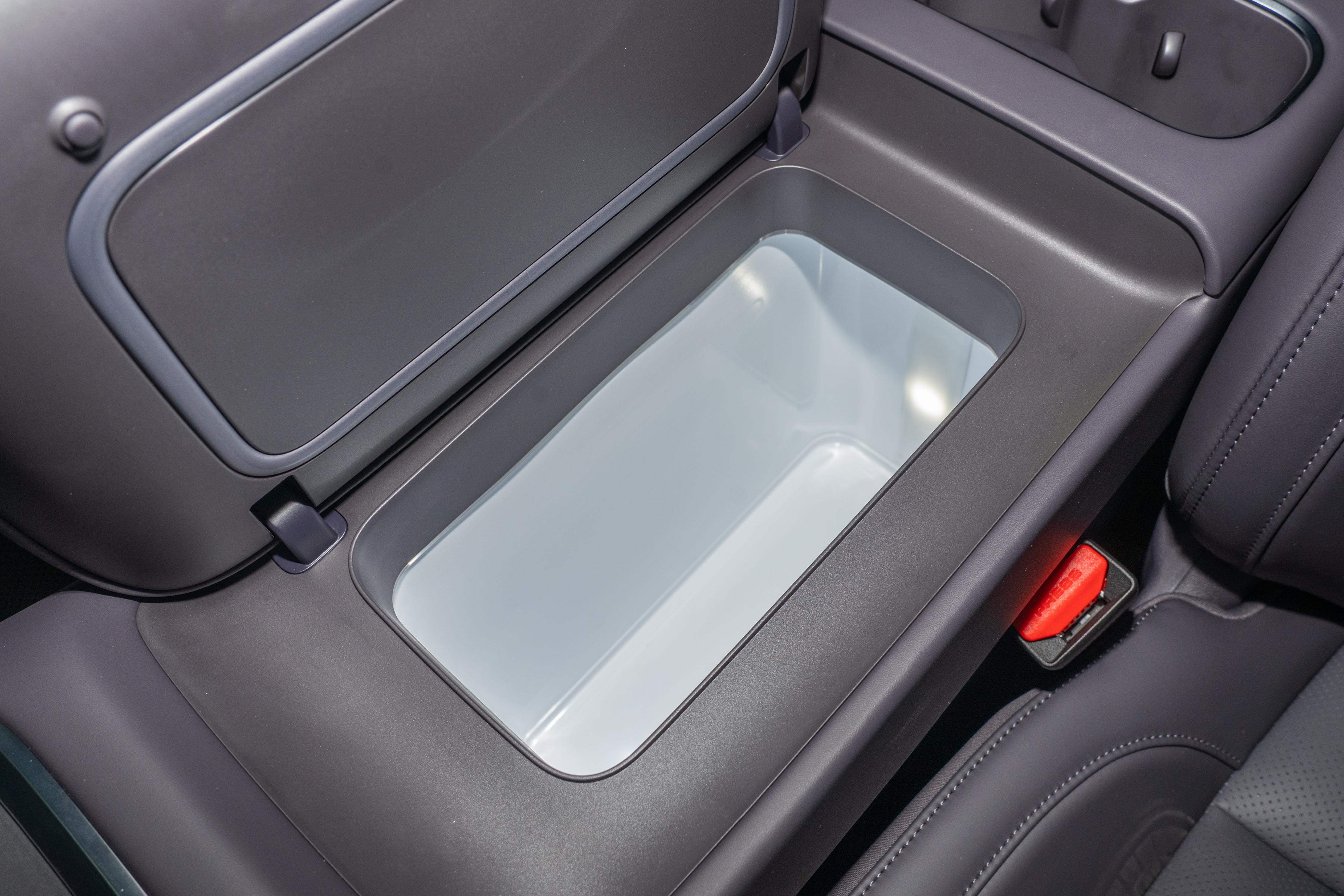 车内的储物空间也挺丰富的,门板上的水杯架很深,放保温杯没问题;中央通道有储物格,能放手机、钥匙这些小物件;二排和三排也有专门的储物位,全家出行时,每个人的小物品都能找到地方放。高配车型还有 8.1L 的车载冷暖冰箱,夏天能冰饮料,冬天能保温,实用性很强。副驾驶有无线充电,升级到了 50W,还带散热风扇,充电速度快,也不会发烫,高端手机也能满速充电。