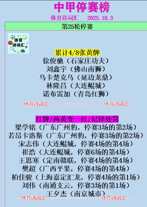 还有11人累计6张黄牌,25人达到5张黄牌,有29人身背4张黄牌,其中有徐俊驰(石家庄功夫)、刘鑫宇(佛山南狮)、乌卡楚克乌(延边龙鼎)、林隆昌(大连鲲城)这4人是刚刚获得第四张黄牌,需要在第25轮里停赛。