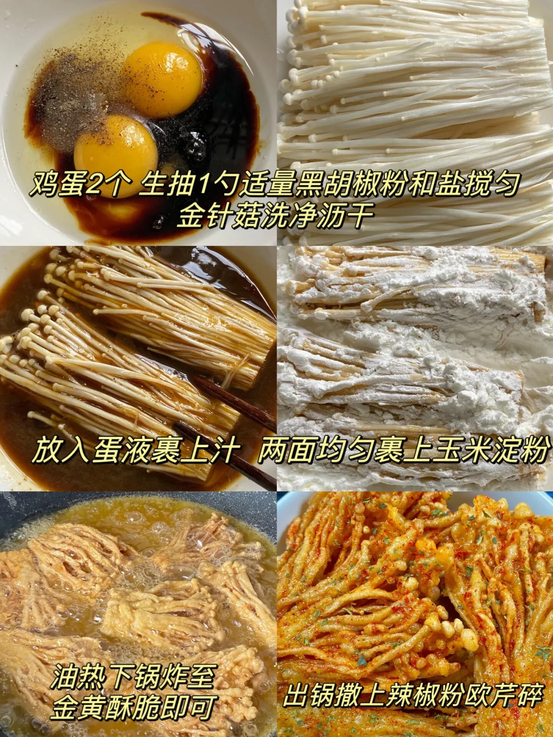 分批炸,不要一锅堆!才会酥脆不软塌!一口咬下去,外面是咔哧咔哧的脆壳,里面还保留金针菇的鲜嫩!