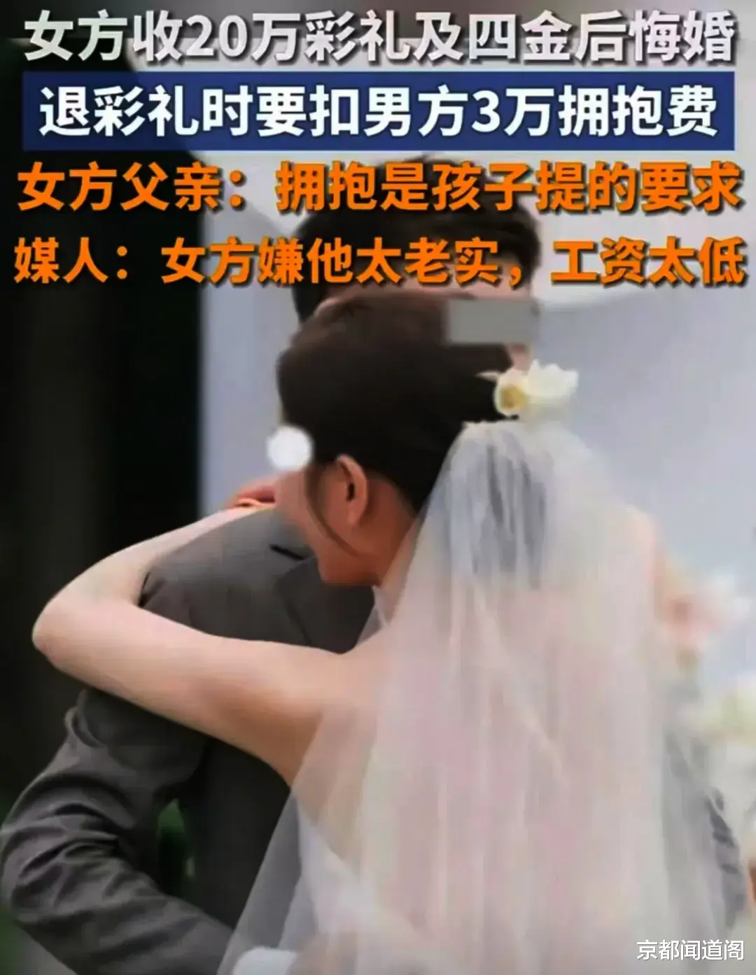 万先生经媒人介绍订婚,支付约20万元彩礼及“四金”后,却在大婚临近时遭遇女方单方面悔婚。更令人错愕的是,在协商退款时,女方竟提出要扣除3万元作为“拥抱费”,理由竟是拍婚纱照时男方曾提出拥抱。经调解,女方最终退还17.05万元。七旬媒人感叹“说媒千对闻所未闻”,而“拥抱费”这个前所未闻的新词,也精准刺中了当下社会婚恋观念异化的敏感神经。