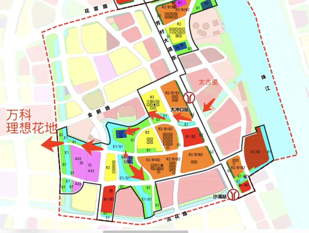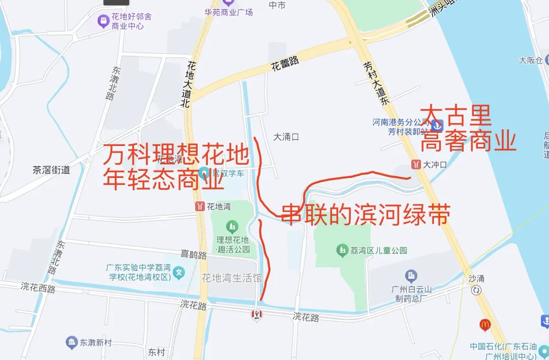 从规划中,我们能大概看出来从滨河绿道,太古里多半可以直接步行到花地湾,从高奢到年轻住区,聚龙湾联动理想花地,必然是广州年轻人最喜欢的city walk 。
