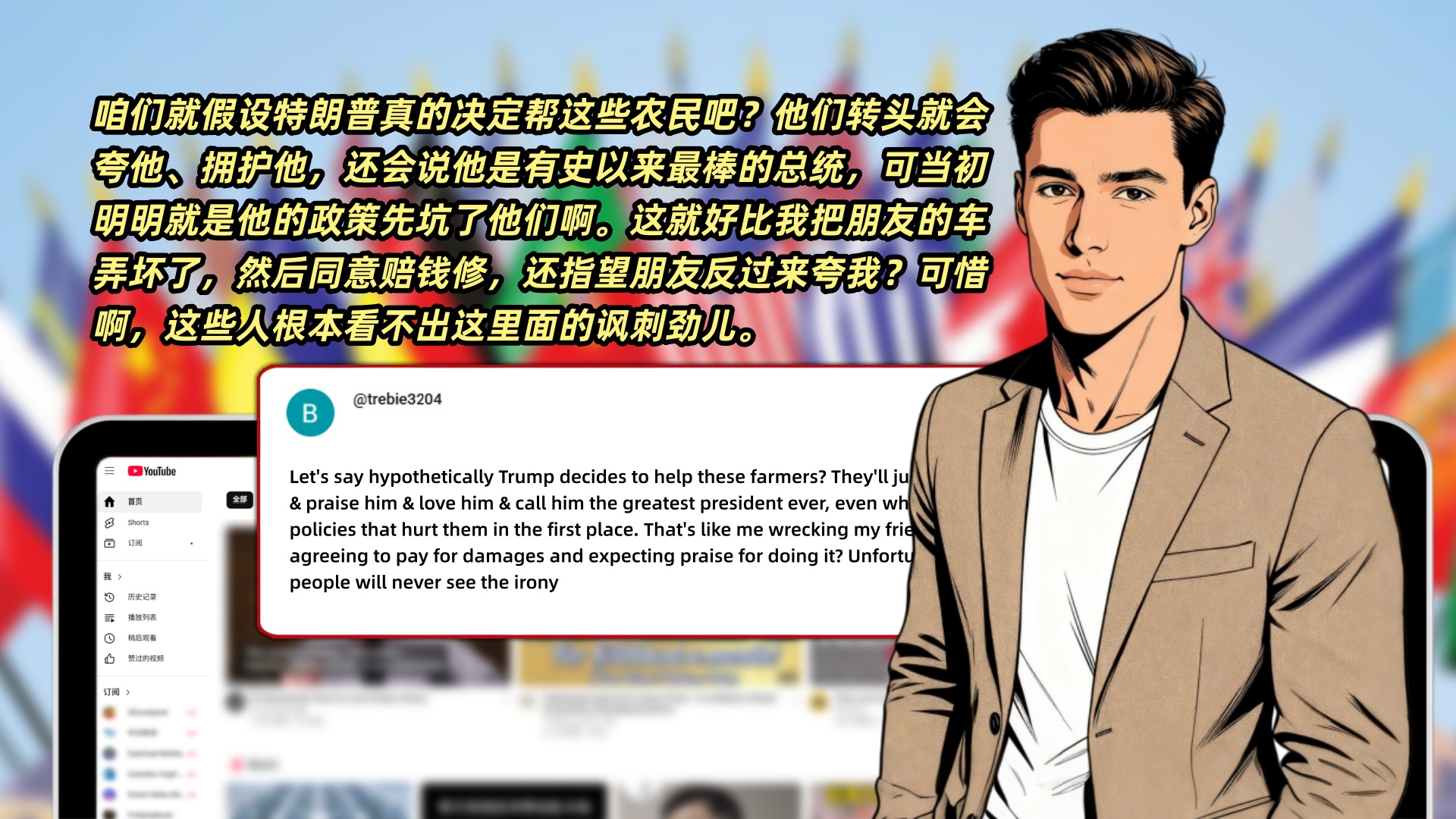 网友trebie3204比喻道:“咱们就假设特朗普真的决定帮这些农民吧?他们转头就会夸他、拥护他,还会说他是有史以来最棒的总统,可当初明明就是他的政策先坑了他们啊。这就好比我把朋友的车弄坏了,然后同意赔钱修,还指望朋友反过来夸我?可惜啊,这些人根本看不出这里面的讽刺劲儿。”
