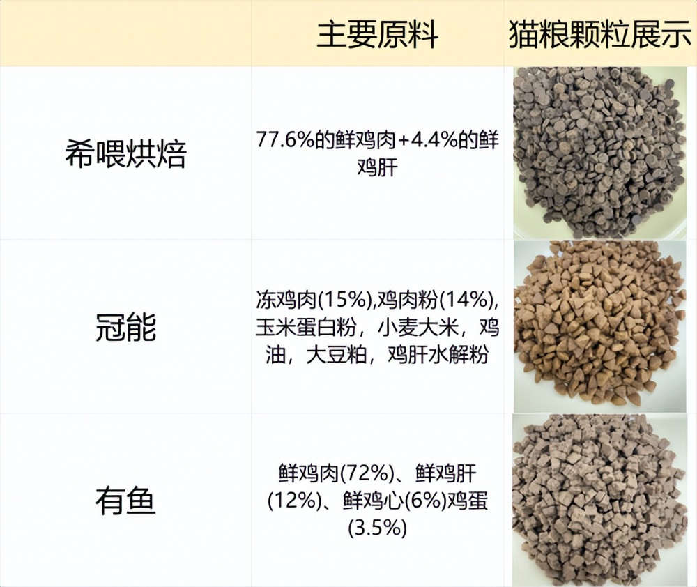 有鱼猫粮:72%鲜鸡肉为主料,辅以12%鲜鸡肝、6%鲜鸡心,提供鸡肉香味。采用低温烘焙而非传统膨化,能更好保留原料本身的风味和营养,颗粒表面干爽不油腻。配料表明确不含任何形式的人工诱食剂。