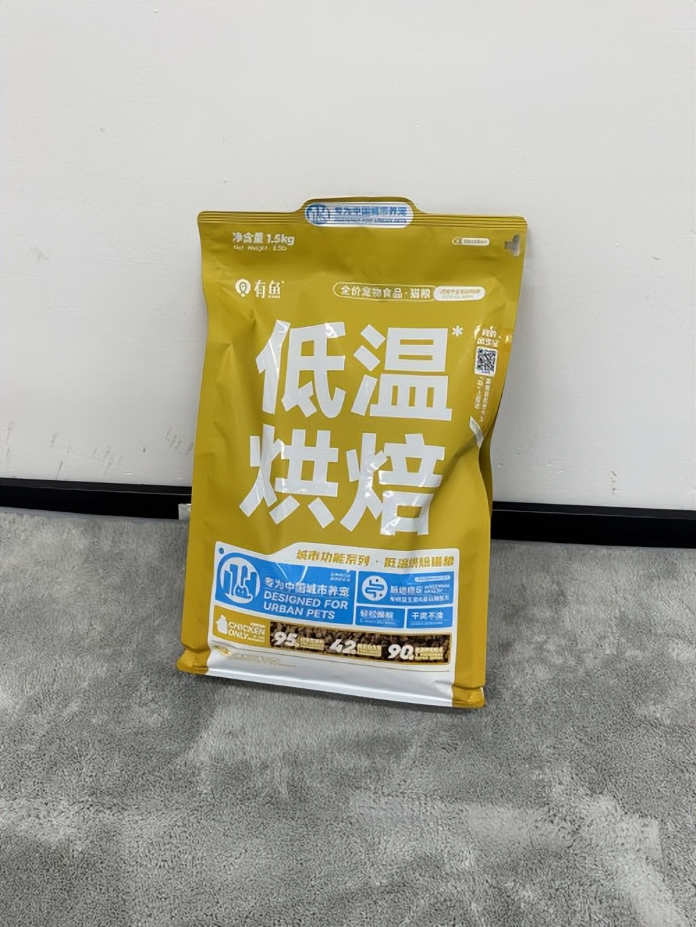 有鱼属于国产中高端猫粮,价格中等,核心原料鲜鸡肉72%、鲜鸡肝12%、鲜鸡心6%、鸡蛋3.5%,均标注了明确供应商,鸡肉、鸡肝、鸡心来自双汇旗下漯河万中禽业加工有限公司,鸡蛋来自辽宁丹东耘垦牧业有限公司等。生产工厂为泰安泰宠宠物食品有限公司,加工工艺为烘焙工艺,配料表中不含人工诱食剂。关键营养指标为粗蛋白≥42%、粗脂肪≥18%、牛磺酸≥0.2%。