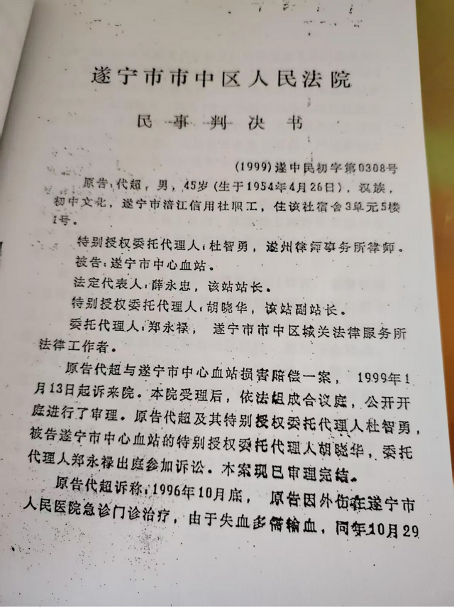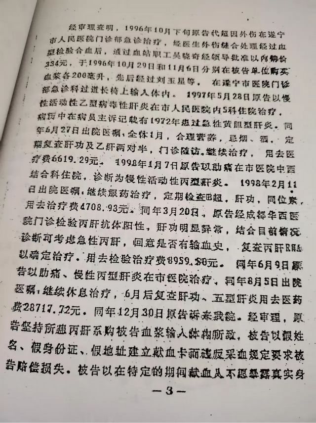 一场本为救命的输血,却让四川省遂宁市某金融机构职工代超,在病痛与维权的双重煎熬中度过了二十余年。1996 年 10 月底至 11 月初,代超因外伤在当地一家医院急诊治疗,因失血过多需紧急输血。通过医院合作的当地血站工作人员吴晓奇,他先后两次输注了共计 400cc 血浆。谁也没想到,这袋本应延续生命的血浆,竟成了他噩梦的开端,将丙肝病毒悄然带入他的身体。