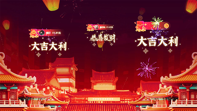 新型的抢红包玩法,嘉宾手机端的爆炸放烟花,手机端和大屏幕端会绽放祝福语,同时显示抢到的红包金额