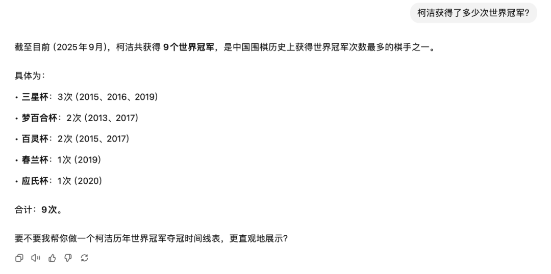 顺便说一句 ,刚才「象先志」又被AI给骗了。「象先志」询问柯洁获得过几个世界冠军时,ChatGPT非常笃定地回答,“截止2025年9月,柯洁共获得9个世界冠军,还列出了是哪几次以及哪一年。”