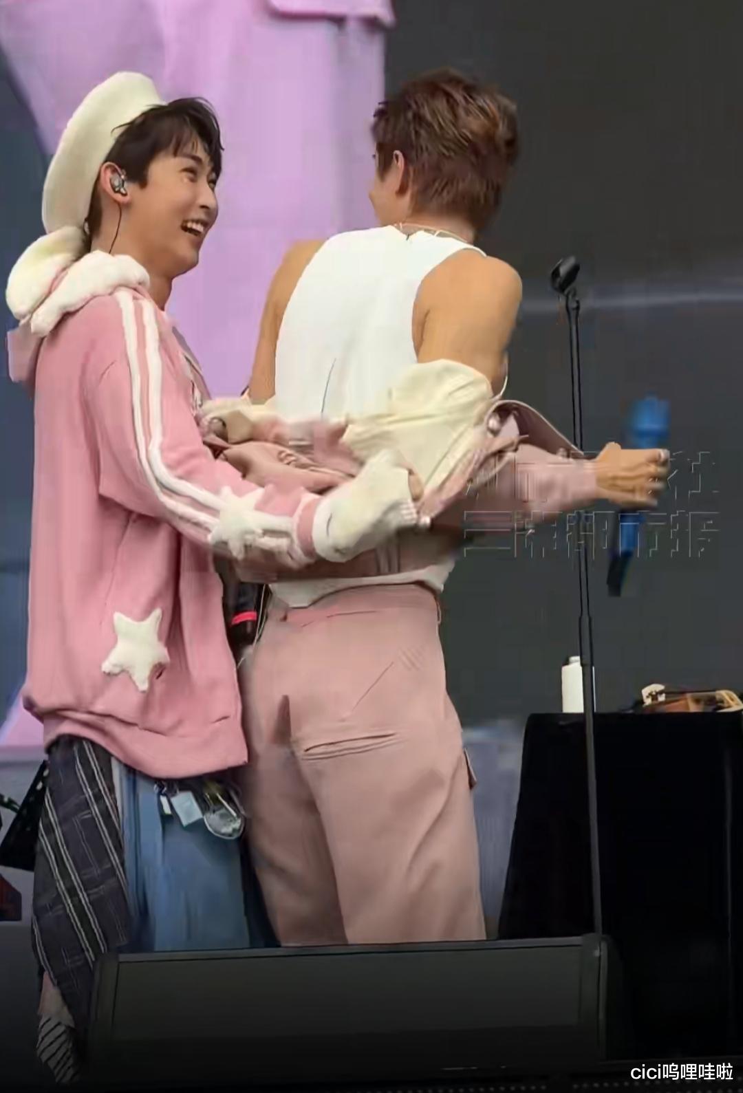 视频显示,唐九洲冲上舞台后,左手抓住周峻纬外套领口,右手迅速扯开,动作行云流水。周峻纬先是一愣,随即笑着追打对方,台下观众瞬间沸腾,尖叫声穿透音乐节现场。周峻纬被扒衣后仍保持微笑,边整理衣物边调侃“唐九洲你完了”,而唐九洲则躲在工作人员身后做鬼脸。