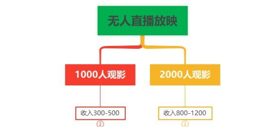 有专业的运营人曾经做过统计,这类无人直播放映间,1000人在线的变现能力为300-500;2000人在线的变现能力为800-1200左右。那么你一定很好奇,无人直播放电影的收益究竟从何而来?