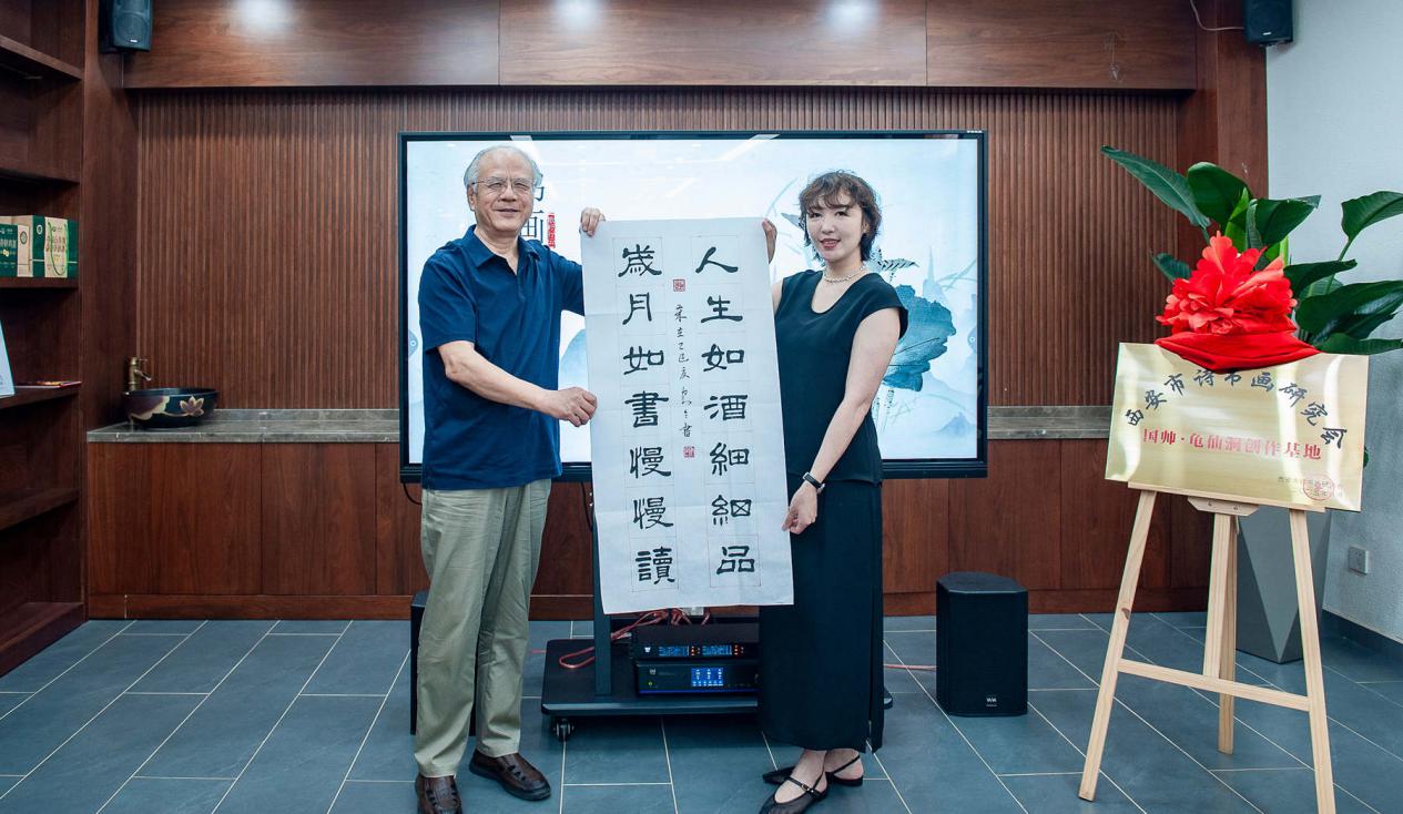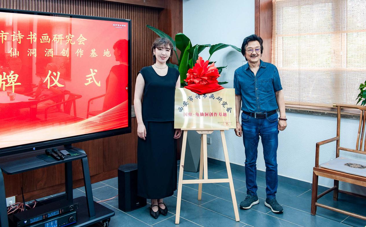 西安市诗书画研究会会长傅晓鸣与国帅·龟仙洞酒品牌西北运营中心总经理韩娜共同为西安市诗书画研究会龟仙洞酒业创作基地揭牌。