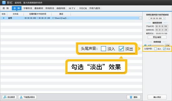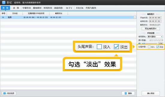 打开影忆,导入需要调节的视频,不管是想让结尾声音淡出,还是开场声音淡入,操作都超简单: