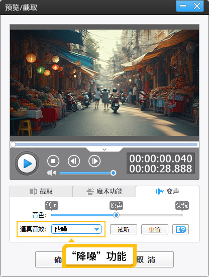 智能降噪:视频有环境噪音、杂音?勾选“降噪”功能,AI自动去除背景噪音,让人声、背景音乐更清晰。